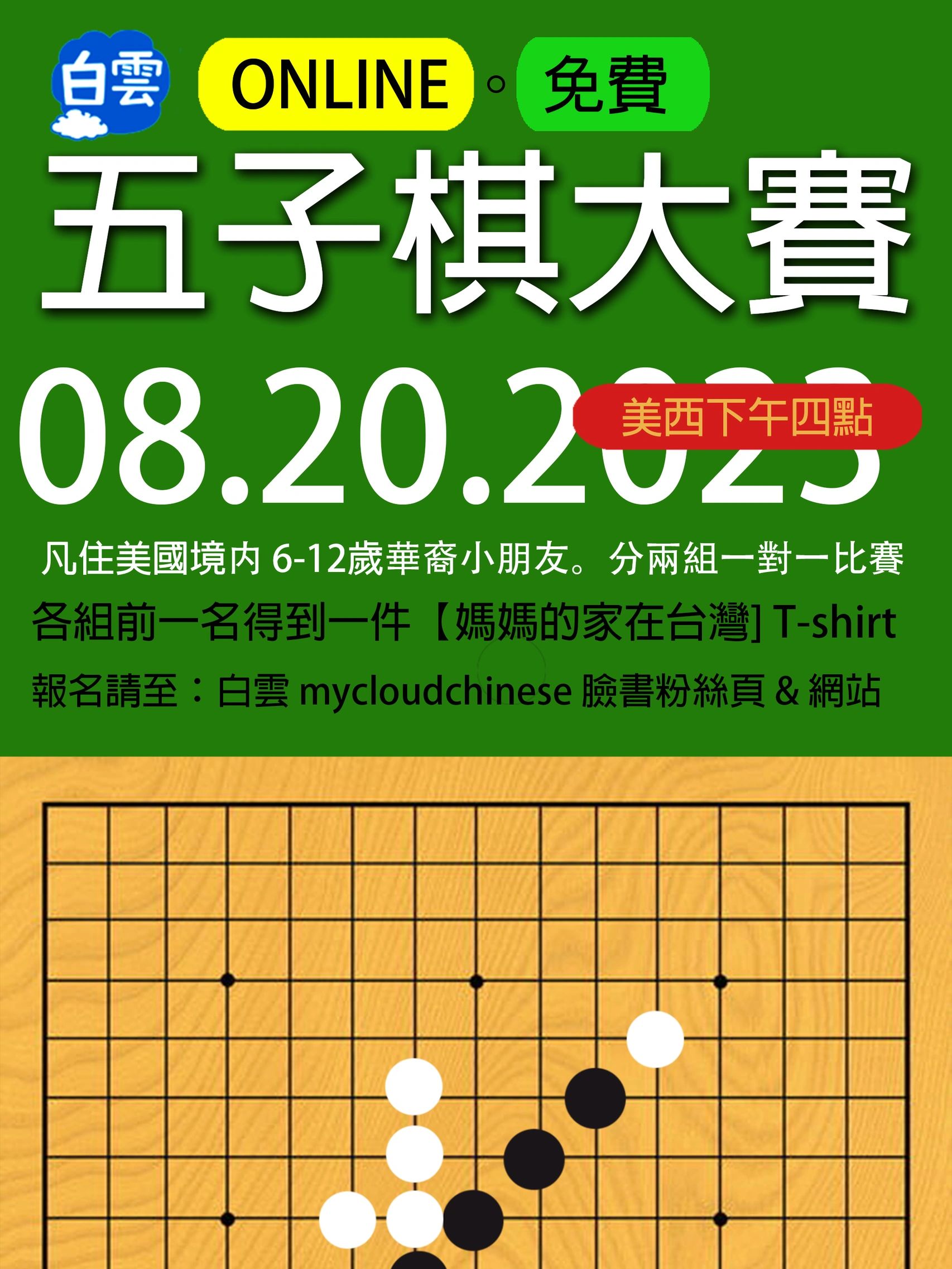 白雲寒暑假期間,都會舉辦特別文化活動,2022 線上五子棋大賽幼年組6-8歲比賽結果,恭喜田宇晴(幼年組)、朱千玗(少年組)獲勝 五子棋不會太難,許多孩子已經會Connect4 了,規則雷同。這是一個老少咸宜,可以從小玩到大的遊戲。不會的小朋友,趕快學起來! 1- 對象:凡住美國境内 6-12歲華裔小朋友。 2- 分分兩組一對一比賽,幼年組- 6-8 (含)歲,少年組- 9-12歲 以上。