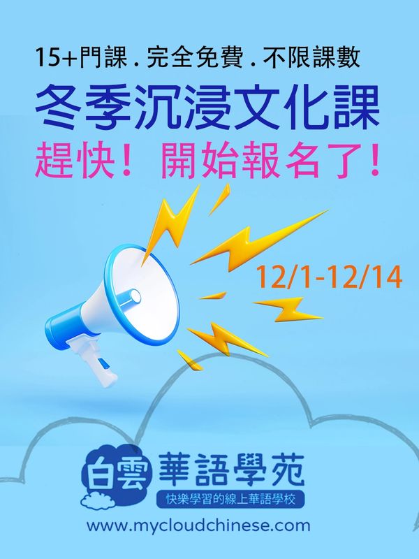 秋季學期結束後,白雲爲了讓所有學生可以持續學習中文!特別在感恩節與聖誕節之間, 推出十五門 「台灣文化主題課程」。白雲所有學生可如參加 "社團活動“ 一般,不受限選修任何課程,不限選課數量,完全免費。來!讓我們一同體驗豐富多彩的台灣文化吧!